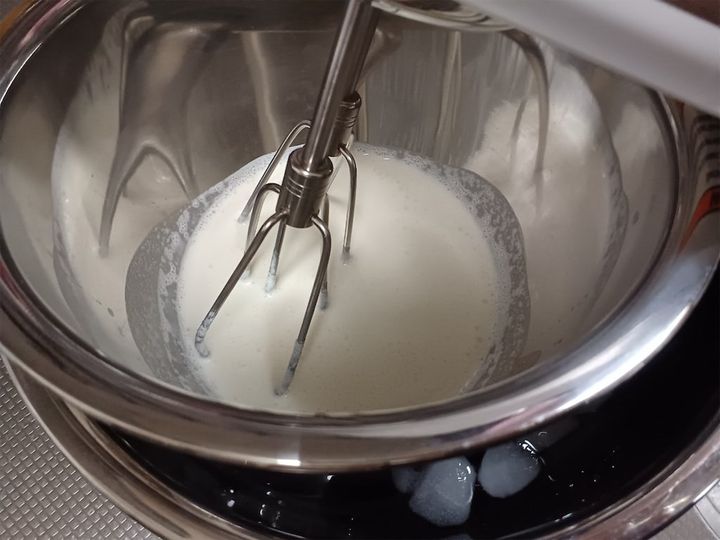 このアイスには、共通してホイップした生クリームを使います。最初に作っておき、それぞれのアイスに半量ずつ加えて作りましょう。