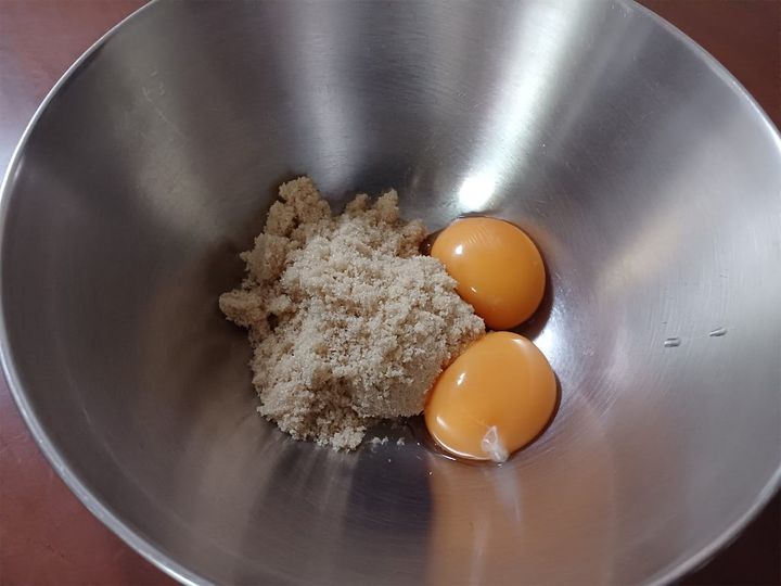 2.ボウルに卵黄と砂糖を入れて、泡立て器で白っぽくなるまで混ぜる。