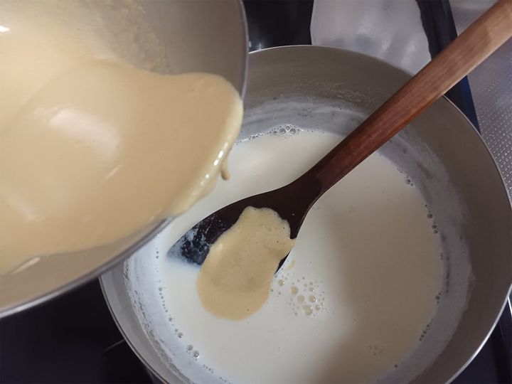 3.極弱火にかけたまま、12を少しずつ加えながら木べらでかき混ぜ、とろみが付いたら火を止める。
