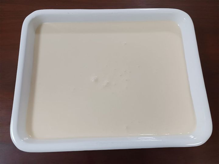 4.2時間ほど冷やしたら一旦取り出してスプーンでかき混ぜ、表面をならして再度冷やす。