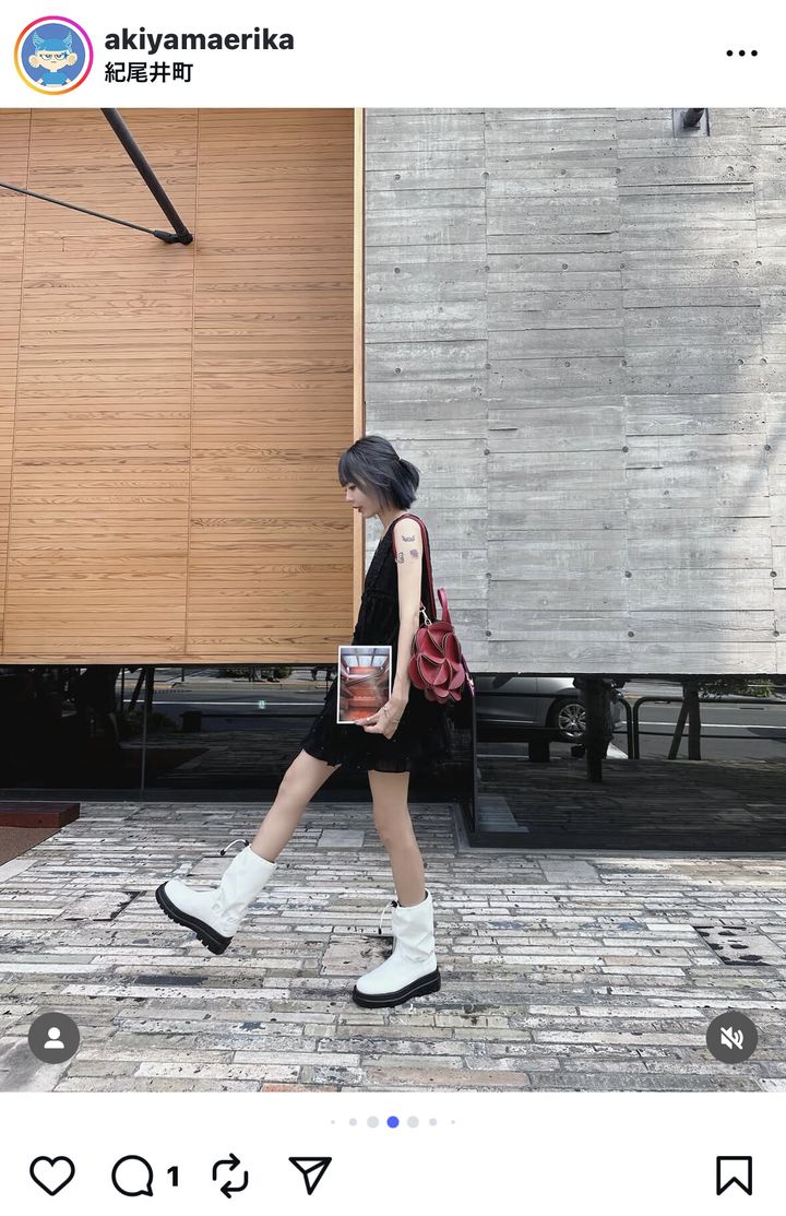 投稿された写真には、ワンピースにブーツの個性的なファッションに身を包んだ秋山の姿が。