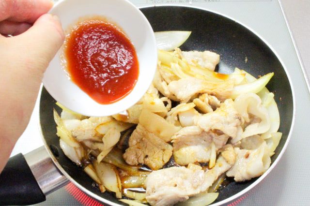 4. 2の豚肉と1のしょうがを加えて軽く炒め、酒、しょうゆ、ケチャップを加えて、全体になじませます。