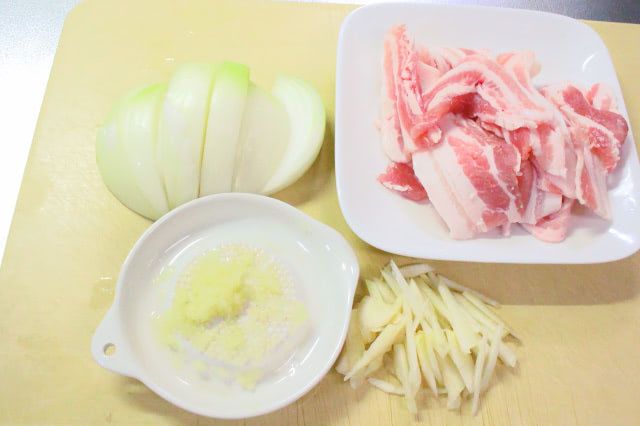 1. 玉ねぎをくし切りに、皮付きのしょうがを千切りにします。にんにくはすりおろし、豚肉は10cm長さに切ります。