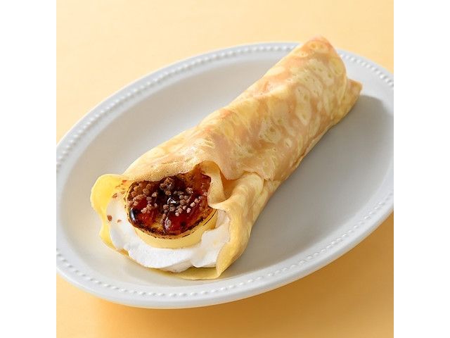 香ばしくブリュレしたカスタード生地がのったクレープです。バナナと、カラメルソースと、食感のあるカラメルチップを包んで最後まで飽きずに食べられます。