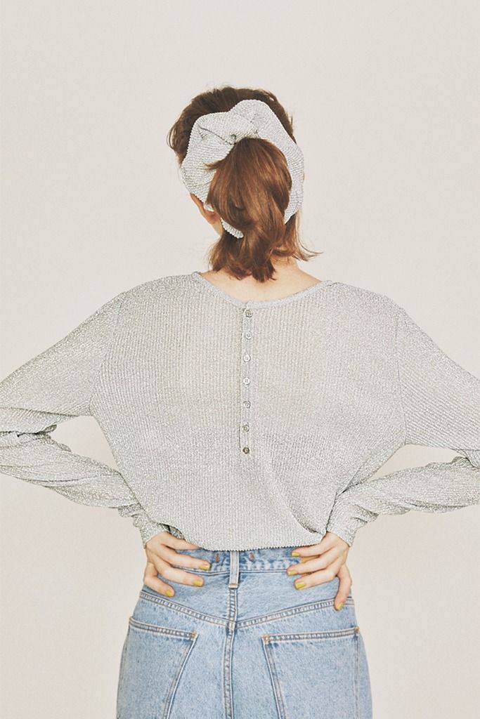 シュシュとトップスがセットになっているから、手をかけずとも統一感のあるバックスタイルが完成。細やかにラメがかったシルバーカラーは、派手すぎないから日常づかいに最適。大きなシュシュでヘアをさっとまとめて、絶妙なこなれ感を演出して。