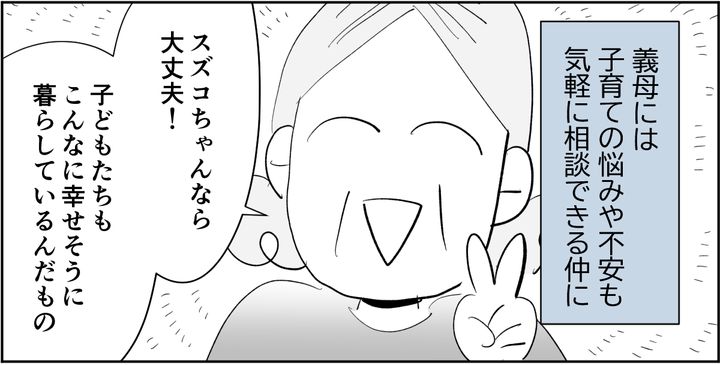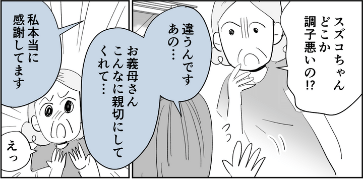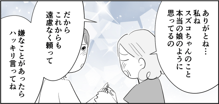 泣き出してしまった私を見て、義母は慌て始めました。「スズコちゃん、どうしたの? どこか調子が悪いの?」私を心配してくれる……そんな義母の気持ちが嬉しく、私は素直にお礼を言いました。すると、私の言葉に今度は義母が目を潤ませました。