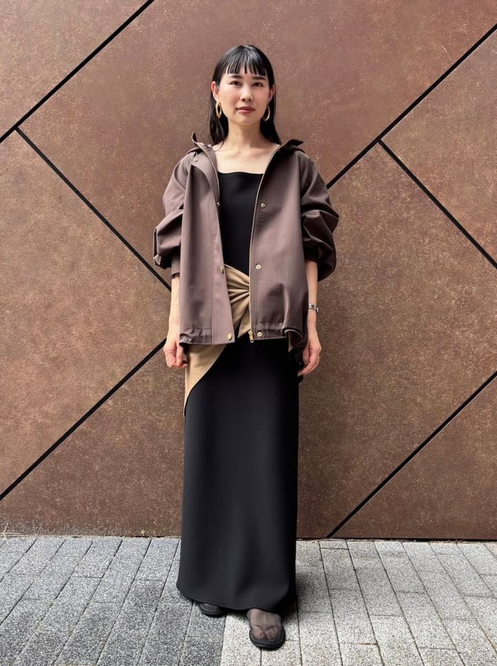 「スッキリとしたIラインシルエットのワンピースに、構築的な丸いフォルムのブルゾンを取り入れ、さらにキャメルのスカーフを腰に巻くことで、スタイリングにメリハリを持たせました。ブルゾンの新色、深いブラウンカラーを取り入れることでトレンド感も意識。丸いフォルムや大き目のアームホールでヌケ感のあるサイズが気に入っています」
