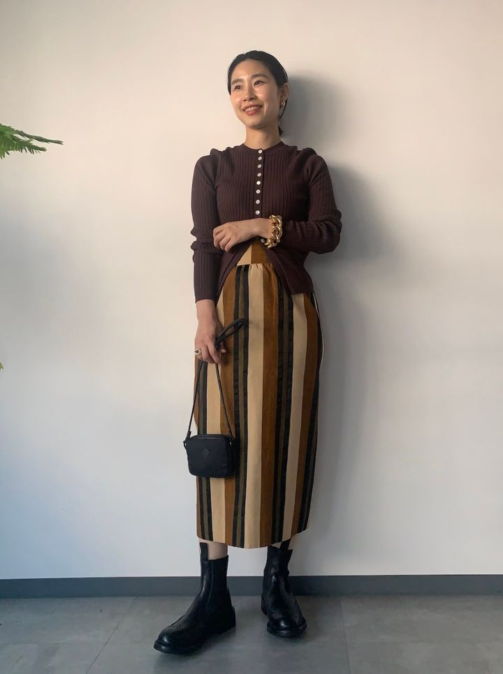 「スタイリング全体をブラウントーンでまとめ、スカートのストライプやカーディガンのボタンデザインで縦のラインを強調。小柄でも、スラッと見えるように意識しました。ほっこりしないよう、エッジのきいたアクセサリーを取り入れたのもポイントです」