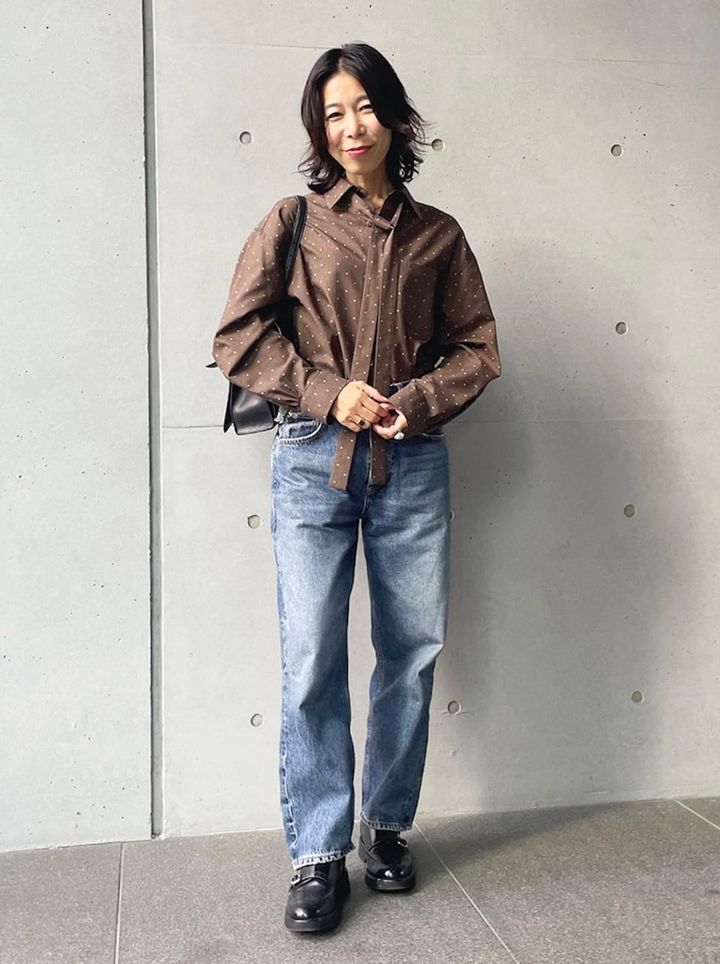 「イタリア製の細かいチェック&ドット柄のドビー素材のシャツ。あたたかみのあるブラウンが素敵で、デパリエらしく他にない生地に惹かれました。トップスが女性らしい印象なので、ボトムはカジュアルにデニムを合わせ、品のよさとリラックス感を両立した大人の王道スタイルに仕上げました」