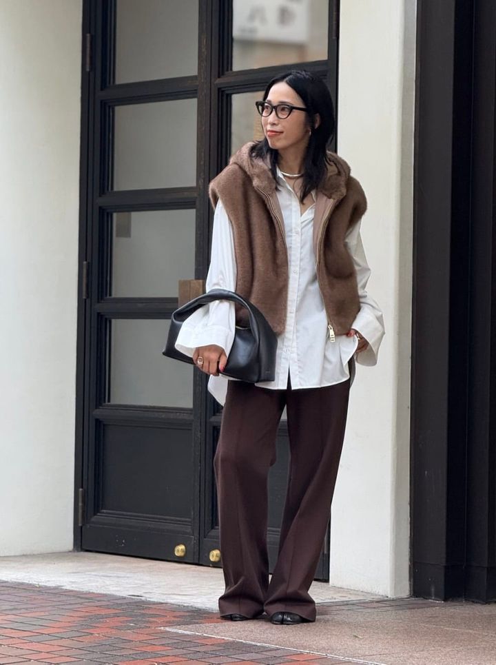「今季はブラウンの中でも特に濃いめのトーンが気になります。脚をキレイに見せてくれるポンチ素材のスラックスをベースに、リラックス感あるオーバーシャツを合わせました。上品なツヤのファーが特徴のフーディーベストも取り入れ、季節感をプラス。アイウエアをはじめ、小物は黒とシルバーで引き締めることでマニッシュにまとめています。フランツロアーのバッグは想像以上に容量もあり使い勝手がよく万能です」