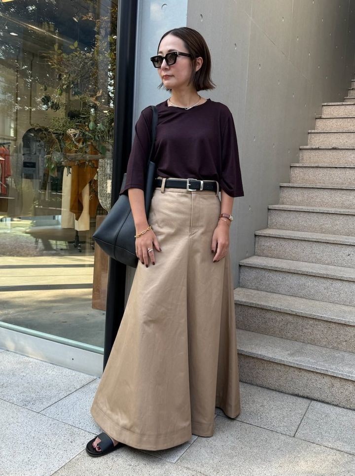 「まだ30度を超える日が続く9月。暑さを感じつつも秋らしさを取り入れられるよう、今季のトレンドカラー“ブラウン”のTシャツを選びました。ウール100%で吸湿性・防臭性に優れ、汗をかいても快適に着られるのが嬉しいポイント。ボトムに合わせたのは、カジュアルスタイルをドラマチックにしてくれるチノスカート。フロントは華やかなフレアが揺れ、バックはすっきりとしたシルエットで、前後で異なる表情を楽しめる1枚です。ベルトやサンダルは黒で締めて、暑い秋ながらもブラウン×ベージュや素材で季節感を取り入れスタイリングしています。スカートにマヌエラ別注のベルトの組み合わせが特にお気に入りです!」