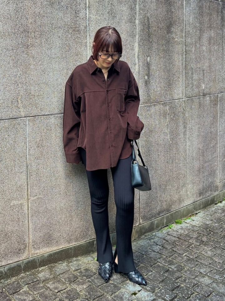 「今年人気のシャツは素材感や色でまわりと差をつけたいアイテム。今回はオーバーサイズのコーデュロイシャツをチュニック感覚で取り入れ、センシュアルなムードのスタイリングに仕上げました。大きめのシャツとタイトなニットパンツのコントラストが、気になる足元を少し細く見せてくれます。存在感のある眼鏡もコーデのポイントです」