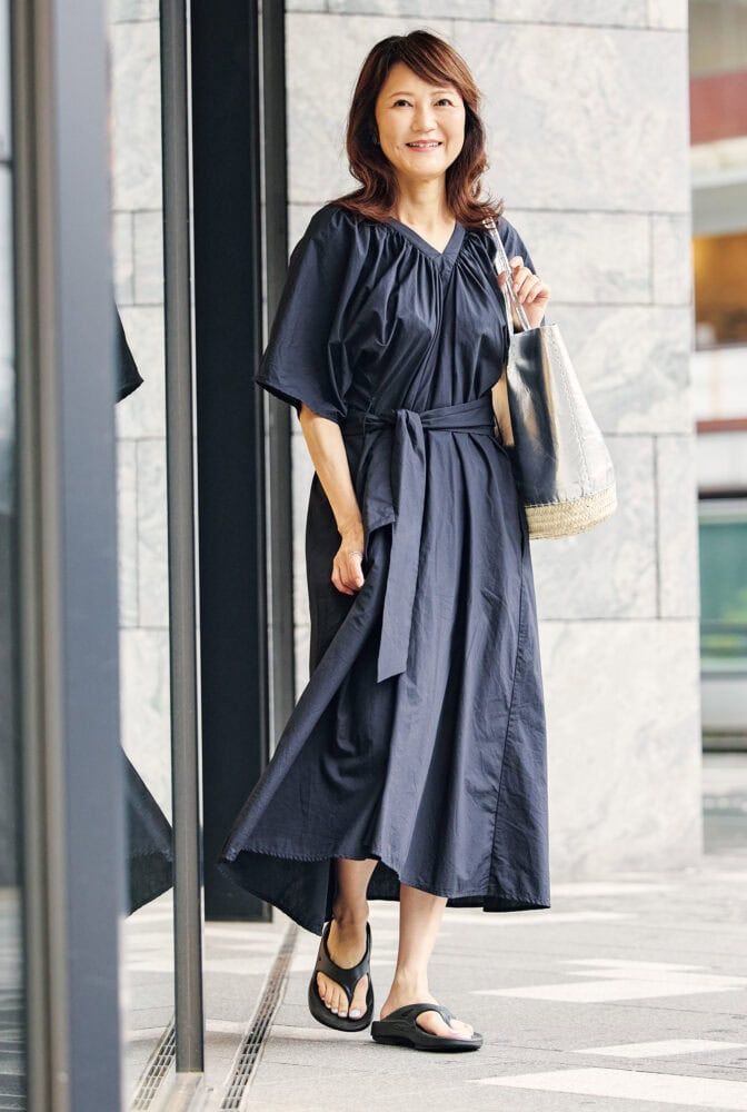 【60代お手本スナップ】1枚でサマになる!エアリーなブラックワンピースはサンダルで軽やかに着こなして!