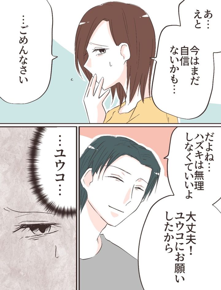 「あ・・えと、今はまだ自信ないかも・・ごめんなさい」と謝りました。すると、「だよね・・ハズキは無理しなくていいよ。大丈夫!ユウコにお願いしたから」笑顔でそう話すリヒトさん。でも、ハズキさんは「・・ユウコ・・」と呼び捨てで名前を呼ぶリヒトさんの言葉が気になって仕方ありません。