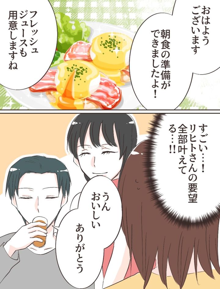 「おはようございます。朝食の準備ができましたよ!フレッシュジュースも用意しますね」そう言ってテーブルに出したのは、完璧に仕上がった美しいエッグベネディクト!それを見て、「すごい・・!リヒトさんの要望全部叶えてる・・!!」と心の中で驚くハズキさん。リヒトさんは差し出されたフレッシュジュースを飲み、「うん。おいしい。ありがとう」とユウコさんに言いました。