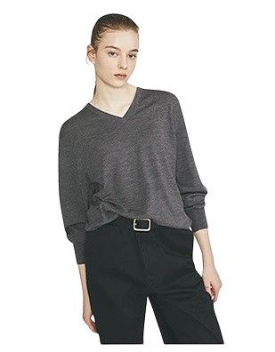 「デコルテを見せて1枚で着たときも、メンズならではのゆるめなサイズ感で気だるく品のある表情。Vでネックラインはシャープに。左右に開きすぎず、縦に深すぎないVネックなので、アウターの中に着てもじゃまになりません。カラバリもさまざまなので、何枚かそろえてもいいと思います」(樋口さん) メリノVネックセーター(メンズ)/UNIQLO