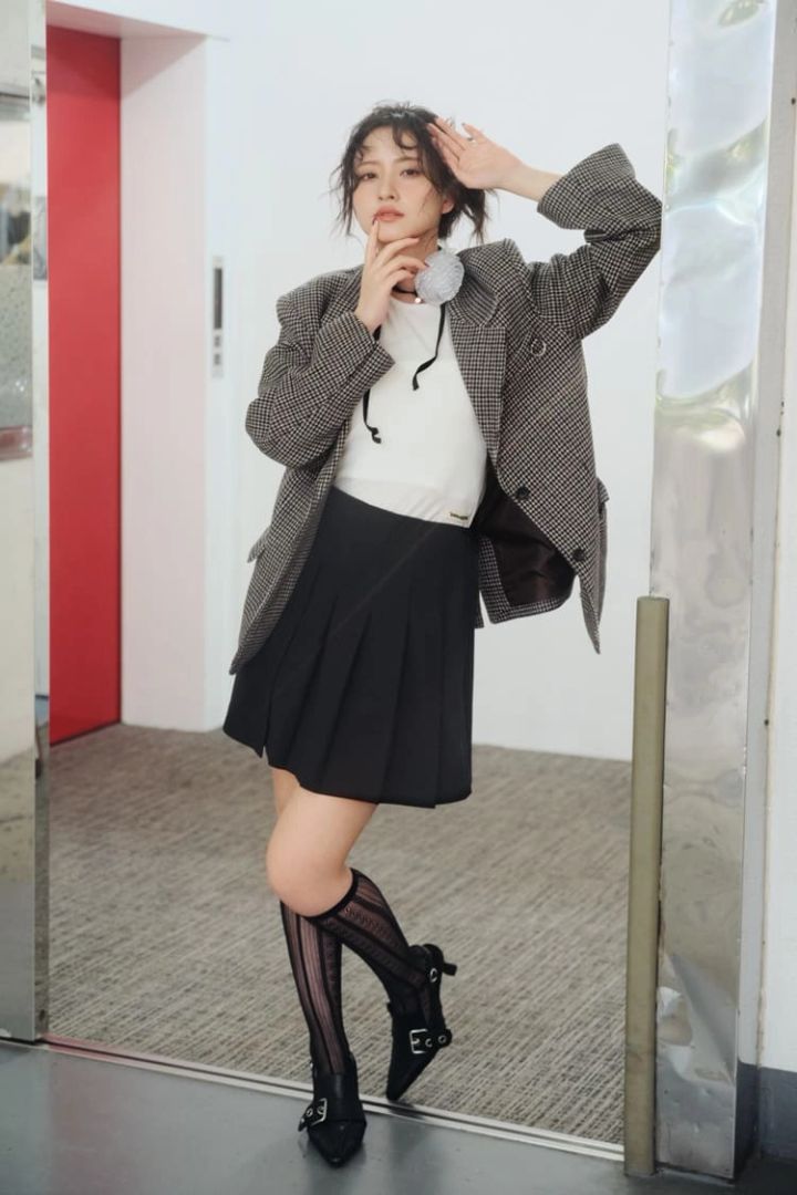 チェックジャケット 15,950円/MURUA 白タンクトップ 5,830円/WOOALONG(HANA KOREA)黒ミニスカート 9,790円/LILLIAN CARAT(リリアン カラット)チョーカー 2,750円/アネモネ(サンポークリエイト)ハイソックス 1,100円/靴下屋(Tabio)パンプス15,950円/MOUSSY(バロックジャパンリミテッド)