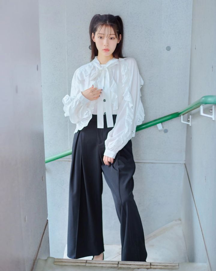 黒スラックス 5,979円/チック(ROOP TOKYO)白リボンボウタイシャツ 17,380円/シスタージェーン(ザ・ウォール ショールーム)パンプス10,890円/RANDA ヘアゴム/スタイリスト私物