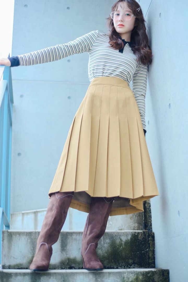 ボーダーポロトップス 8,280円/CRANK(HANA KOREA)ベージュプリーツスカート 25,300円/フレッドペリー(レイ ビームス 新宿)サングラス41,800円/スプリング ストリングス(SHOWROOM CHRMR)ブーツ18,700円/rienda(バロックジャパンリミテッド)ヘアピン/スタイリスト私物