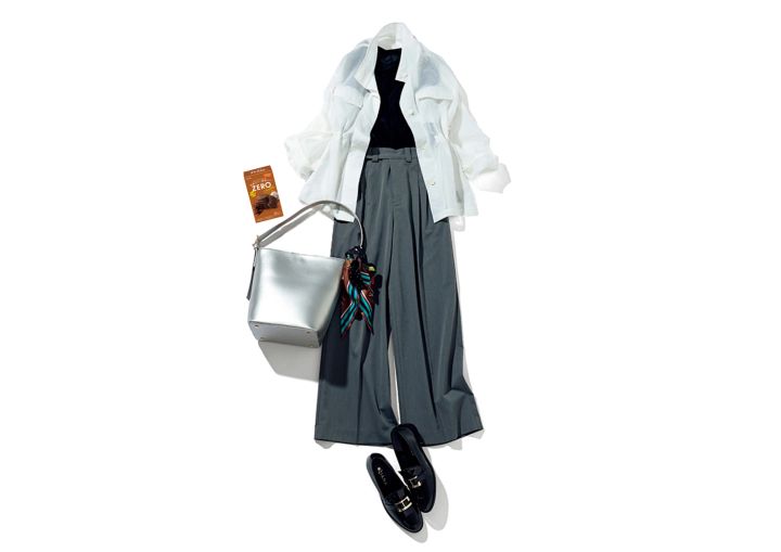 シアーブルゾン¥37,400/アンクレイヴ(オンワード樫山) ベロアカットソー¥11,000/ストロベリーフィールズ(シュガー・マトリックス) グレータックパンツ¥12,980/ギャレスト(ワールド) ローファー¥18,150/ダイアナ(ダイアナ 銀座本店) シルバーショルダーバッグ¥11,000/アルテミス by ダイアナ(アルテミス by ダイアナ アーバンドック ららぽーと豊洲店) スカーフ¥16,500/マニプリ ゼロシュガーフリービスケット〈ショコラ〉オープン価格/ロッテ