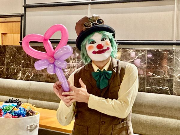 クラウン(ピエロ)姿のバルーンアーティストがバルーンアートをプレゼントしてくれます!