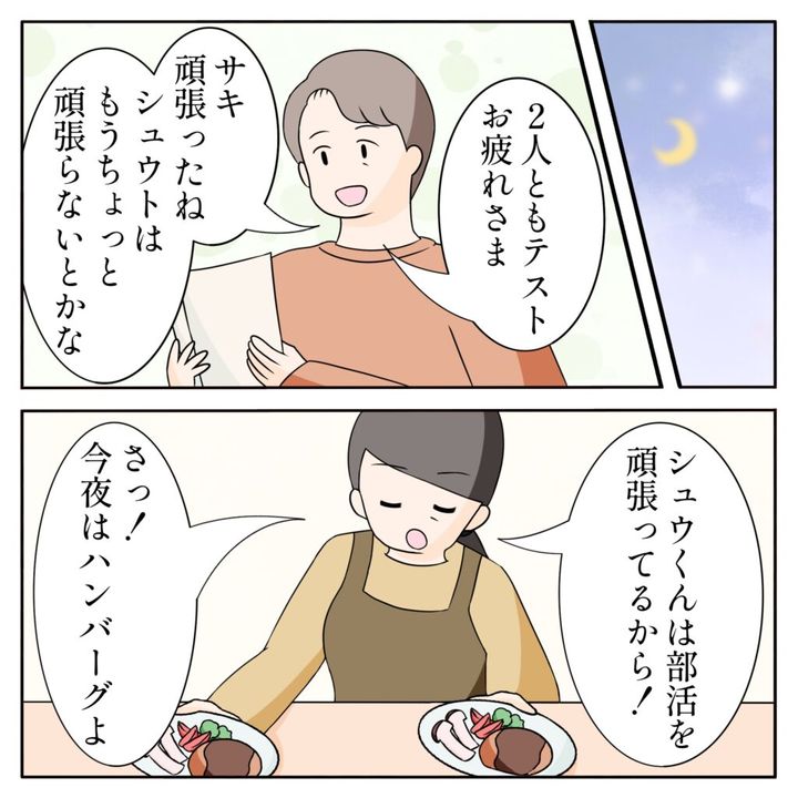 テスト勉強を頑張って良い点を取れたものの、母には素っ気なく「当たり前」と言われてしまいましたが、夕飯の時に父には「頑張ったね」と言ってもらえて嬉しくなりました。「シュウトはもうちょっと頑張らないとかな」と父が言うと、すかさず母が「シュウくんは部活を頑張ってるから!」とフォロー。でも本当に、シュウトは全教科赤点ギリギリはやばいよ?