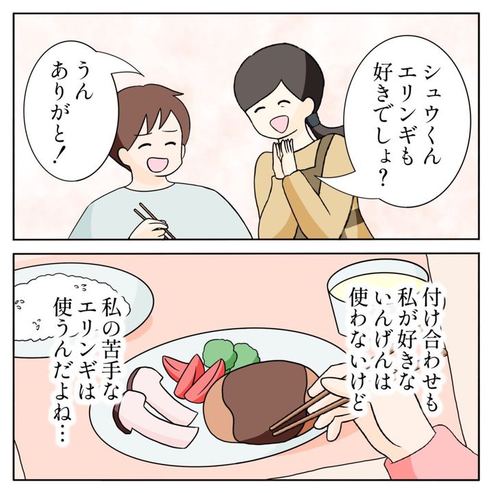 付け合わせも私が好きないんげんは使わないけど、苦手なエリンギは使うんだよね。そもそも私の好き嫌い、母は覚えているのかな。「シュウ君、エリンギも好きでしょ?」と嬉しそうにシュウトに言っている母と「うん、ありがと!」と笑顔のシュウトを目の前に、なんだかモヤモヤしました。