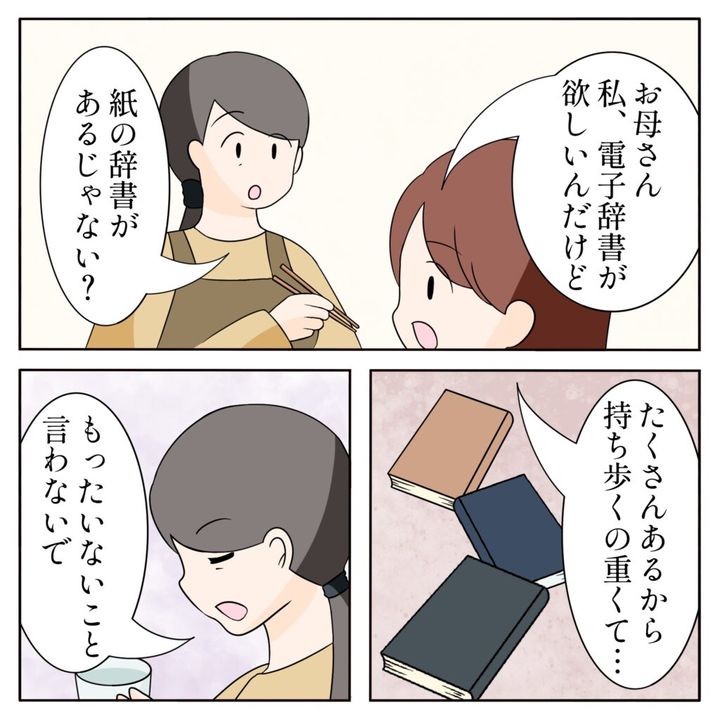 それなら私も。「お母さん、私、電子辞書が欲しいんだけど」とお願いしました。母が「紙の辞書があるじゃない?」と言うので、「たくさんあるから持ち歩くの重くて」と説明しましたが、「もったいないこと言わないで」とそっぽを向かれてしまいました。母はいつもこう。シュウトとまるで扱い方が違います。