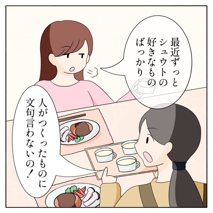 この日の夕飯はハンバーグ。「最近ずっとシュウトの好きな物ばっかり」と私は思わずため息交じりに言ってしまいました。すると「人がつくったものに文句言わないの!」と母に怒られて、確かにそうなんだけど、でも。