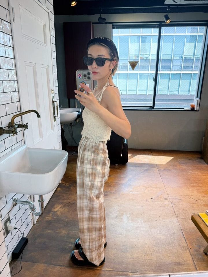 3. 【30代スナップ】CLANEの柄パンで個性を追加 秋の肌見せコーデはニットキャミを主役にナチュラルカラーでまとめて