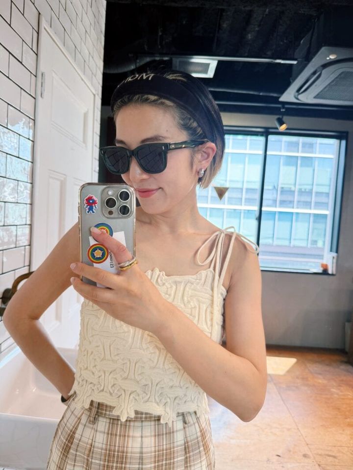 「1枚で映えるニットキャミを主役にした、ベージュのワントーンコーデ。ニットキャミはコンパクトながらデザイン性が高くてお気に入りです。小物は、黒で統一して、メリハリをつけました」(ヘアサロンオーナー 水戸怜子さん)