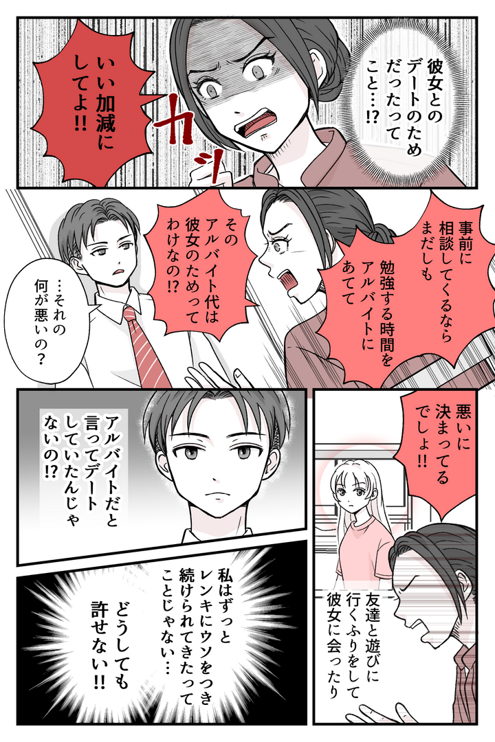 一つのウソをつくと、それを隠すためにどんどんウソを重ねなければならなくなります。友達と会いに行くと言ったのもウソ。アルバイトをする理由も彼女との時間を過ごすため。高校生がこんなことを許されるわけがありませんよね?