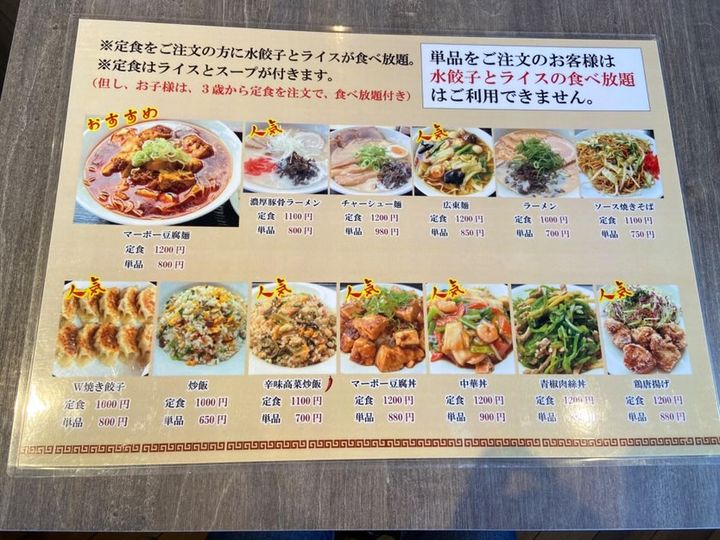 店主さんのおすすめは、マーボー豆腐麺だそうです。人気メニューは、濃厚豚骨ラーメン・広東麺・W焼餃子・辛味高菜炒飯・マーボー丼・中華丼・鶏唐揚げが人気メニューとのこと。