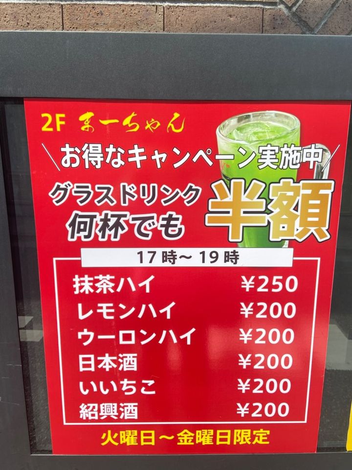 お得なキャンペーン実施中でした。火曜日〜金曜日限定(17時〜19時)は、抹茶ハイ・レモンハイ・ウーロンハイ・日本酒・いいちこ・紹興酒が何杯飲んでも半額です。お酒好きな方は嬉しいサービスですね。月曜日の17時〜22時は、餃子の日で全ての餃子20%割引でいただけますよ。