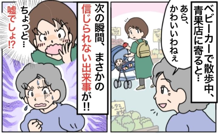 生後3カ月の娘と散歩中、青果店に立ち寄ったときのことです。「かわいいわね」と褒めてくれたおばあさんがいたのですが、娘はまさかの行動をしてしまったのです……。