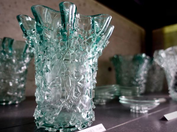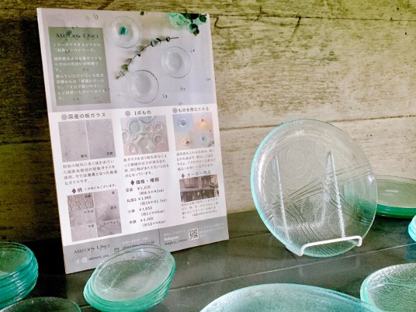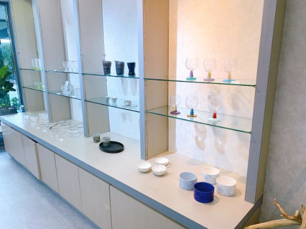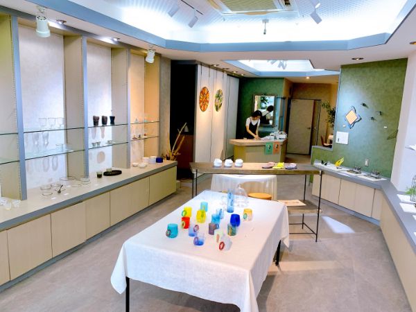 隣はガラス工房。オリジナル作品を手に取ることができます。創業から保管していた昭和レトロガラスを使った品も。