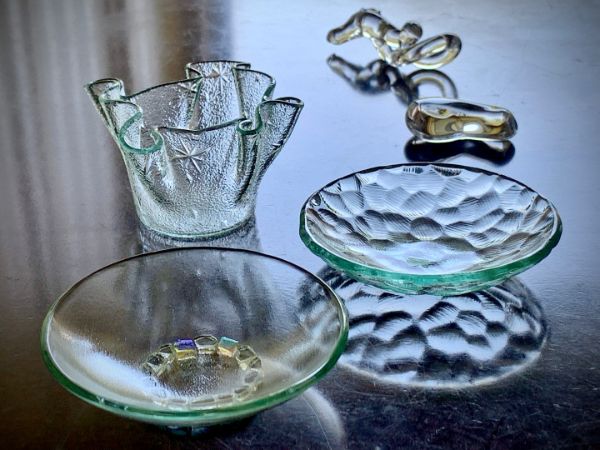 オリジナル作品の昭和レトロガラスの小皿と小鉢、使うたびに気づきがありそうな豆皿も購入しました。