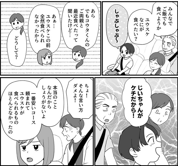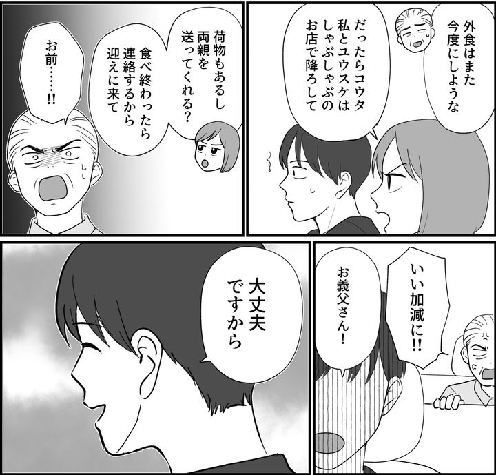 前回は義両親と食事に行ったとき義両親がケチってユウスケは好きなものも食べられず、今日は行けると期待だけさせて行けないなんて可哀想です。