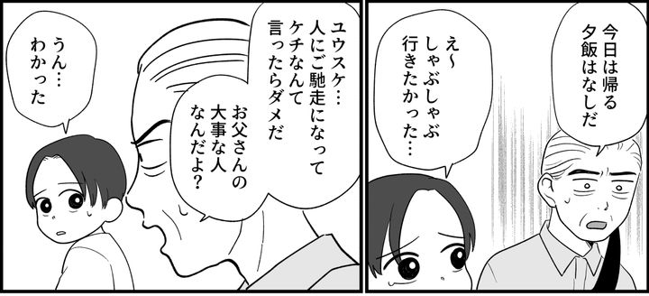 せっかくみんなでご飯屋さんに行けると浮かれていたユウスケは、父の大声と外食に行けないことで泣き出してしまいました。本当のことを言ってなにが悪いんだか。