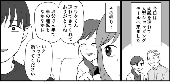 私はカナ(32)。旦那のコウタ(36)とユウスケ(5)と3人で暮らしていますが、義実家は電車で15分、実家も車で15分くらいの位置にあります。会うのはもっぱら実の両親。だって義両親はお金がないのに見栄だけある人たちだけれど、両親はケチではないし、気も遣わないからです。先日義両親と食事に行って、一番安いコースを頼まれ、最悪な時間を過ごしたので連絡先はブロックして疎遠宣言を旦那にしたところ。今日は旦那の運転で、両親たちと大型ショッピングモールに行ってきました。