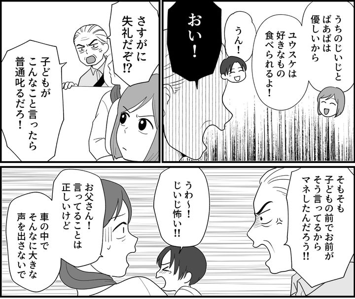 両親を連れてうちの車で外出をしました。その帰りに、みんなで食事をして帰ることになったのです。どこで食べようか話しているときに、先日の義両親との食事会の話題になりました。私も、ユウスケも「義両親がケチだった」事実を話していただけなのに、父が突然怒りだしたのです。