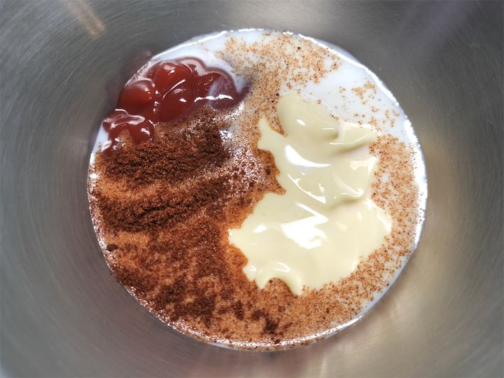 1. ボウルにマヨネーズ、ケチャップ、一味唐辛子、牛乳を入れて混ぜ、オーロラソースを作ります。