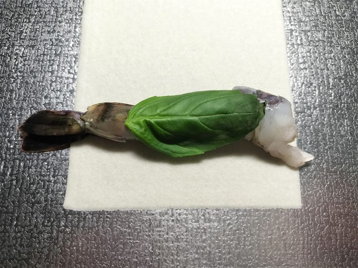 4. 春巻きの皮にエビとバジルを乗せてきつく巻き、端を小麦粉と水で作ったのり(分量外)で止めます。