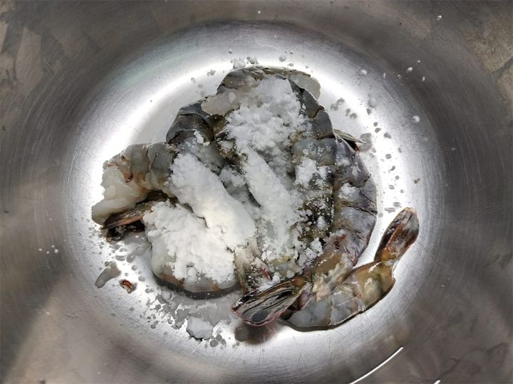 2. ボウルにエビを入れ、片栗粉と塩を振って揉みます。