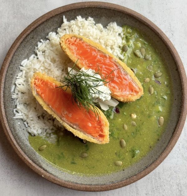 看板メニューの「サーモンレアカツ グリーンカレーソース」は自家製のグリーンカレーソースがさわやかな風味で、辛みが強すぎません。刺身でも食べられる厚切りサーモンを程よいレア加減でカツに仕上げています。複雑な味わいを生んでいるのは、サワークリームとディルのダブルソースです。