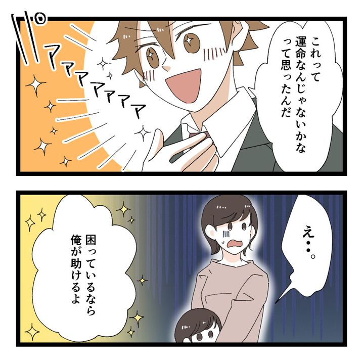 「これって運命なんじゃないかなって思ったんだ」目を輝かせて話すヒロトさんに、「え・・」と言葉を失うマイさん。マイさんの様子にも気づかず、「困っているなら俺が助けるよ」とヒロトさんが言いました。