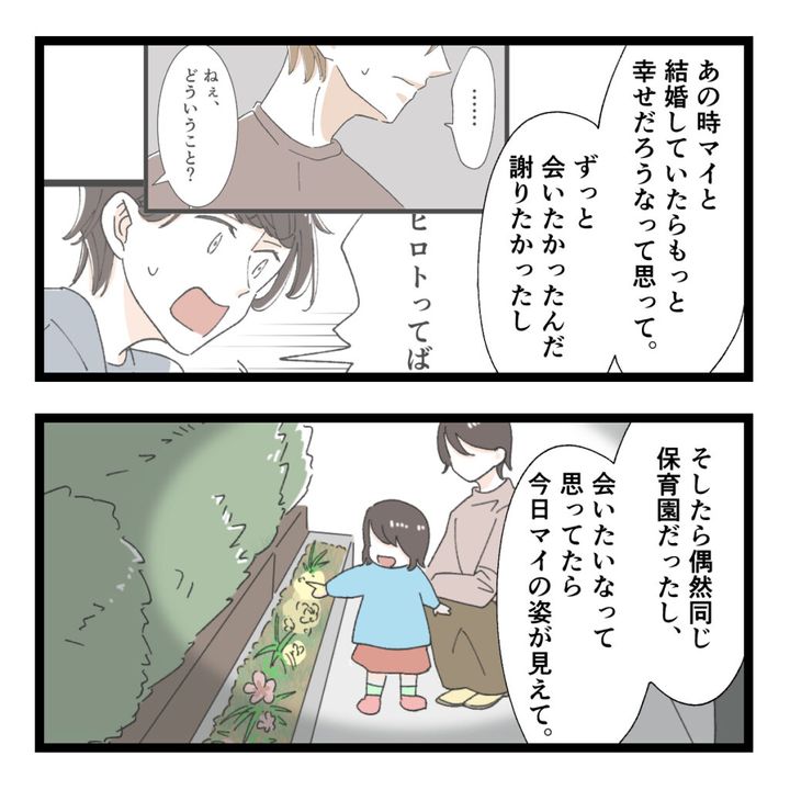「あの時マイと結婚していたら、もっと幸せだろうなって思って。ずっと会いたかったんだ。謝りたかったし。そしたら偶然同じ保育園だったし、会いたいなって思ってたら今日マイの姿が見えて」