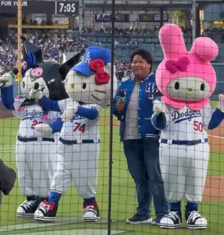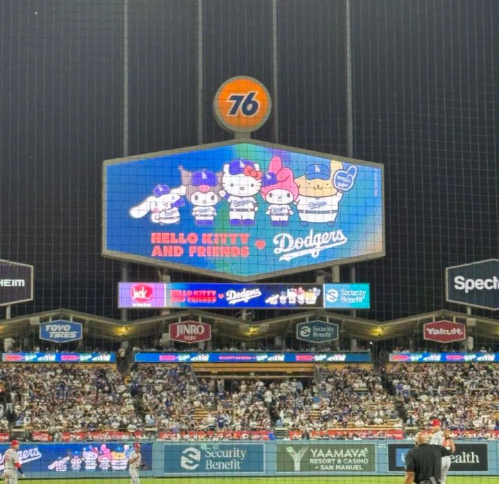スクリーンには、ドジャースのユニフォームを着たサンリオのキャラクターたちが!