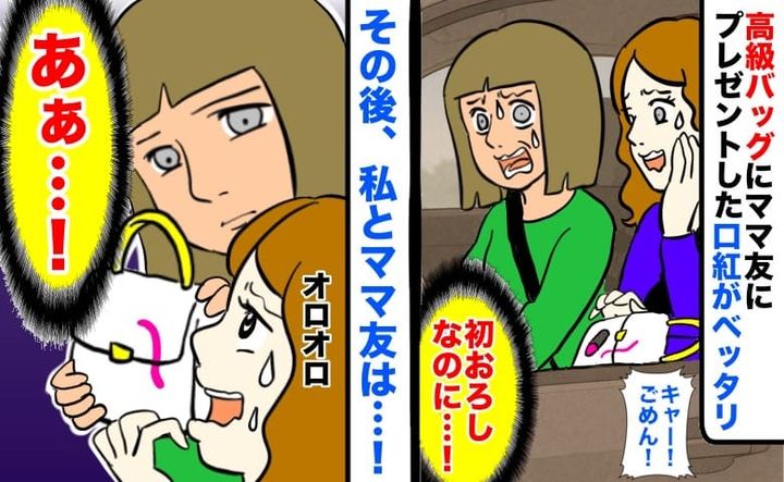 「キャー!ごめん!」という叫び声に驚きママ友のほうを見ると、買ったばかりの高級ブランドバッグに、鮮やかなピンクの口紅がベッタリと付着していました。あのときの絶望感は忘れられません。