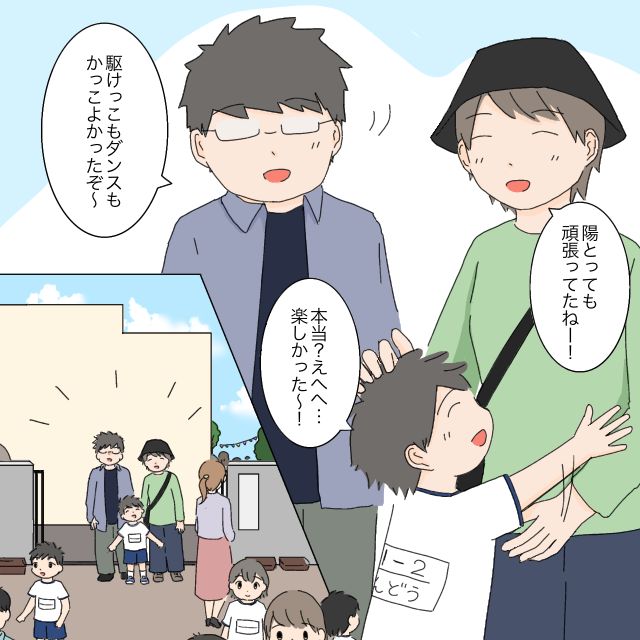 運動会は午前中でおしまいです。陽は満面の笑みで私たちの所へ駆け寄ってきました。「陽、とっても頑張ってたね!」「かけっこもダンスもカッコ良かったぞ~」と話しながら校門を出ようとすると